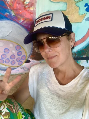 Introducing Black Hole Sun, a dynamic 30 x 30 inch mixed media piece crafted on wood. Its innovative design ensures it hangs perfectly flat while hovering an inch from the wall, creating an engaging visual depth. This colorful and playful artwork has already garnered recognition, securing second prize at the SBAA show in Santa Barbara. With metallic accents that illuminate and shift with the light, "Black Hole Sun" brings an immediate sense of joy and vitality. This piece effortlessly elevates any space, infusing it with an uplifting spirit and boundless energy.