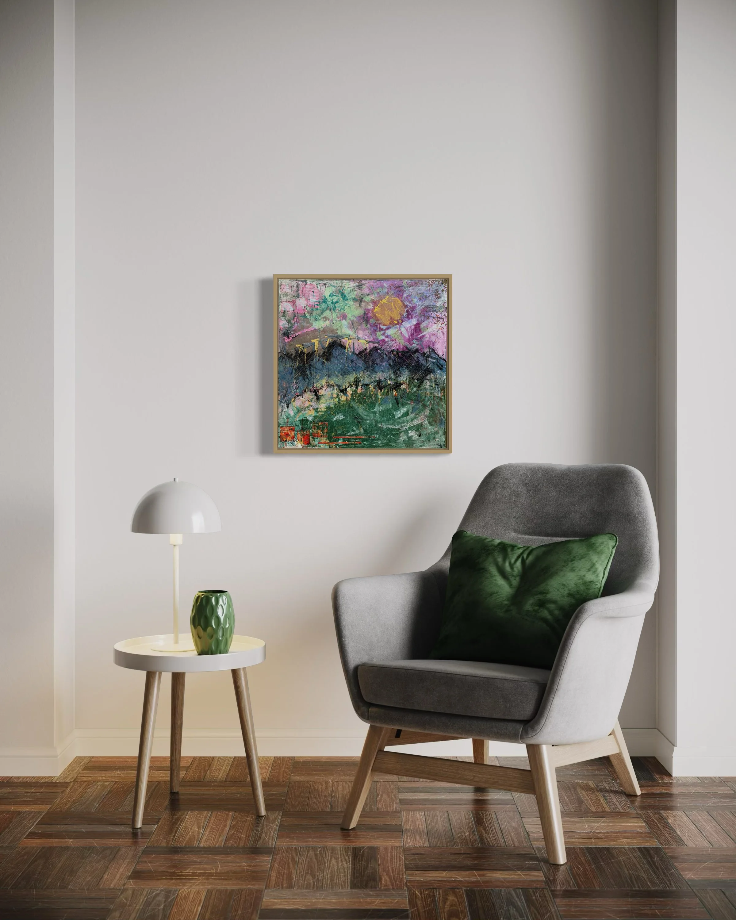 SOLD Discover Purple Skies,"a striking 20x20 mixed media artwork, beautifully presented in a custom blonde floating frame. This abstract piece artfully resembles a landscape, with its deep purples hinting at either a vibrant sunset or a tranquil sunrise. The rich, palpable texture, built through multiple layers of paint applied with a palette knife and a mix of other mediums, gives "Purple Skies" a unique tactile quality that is both dramatic and profoundly calming.
