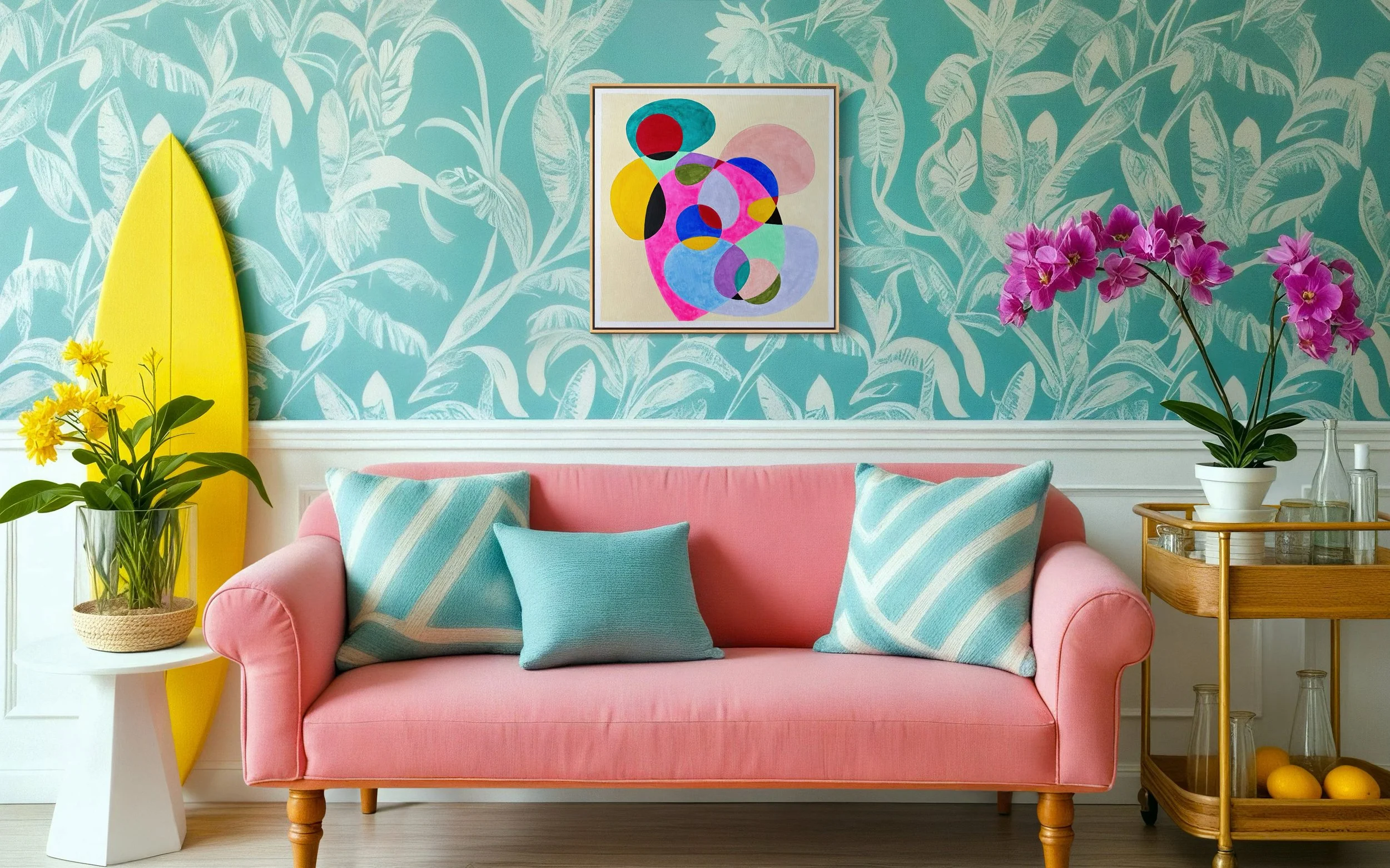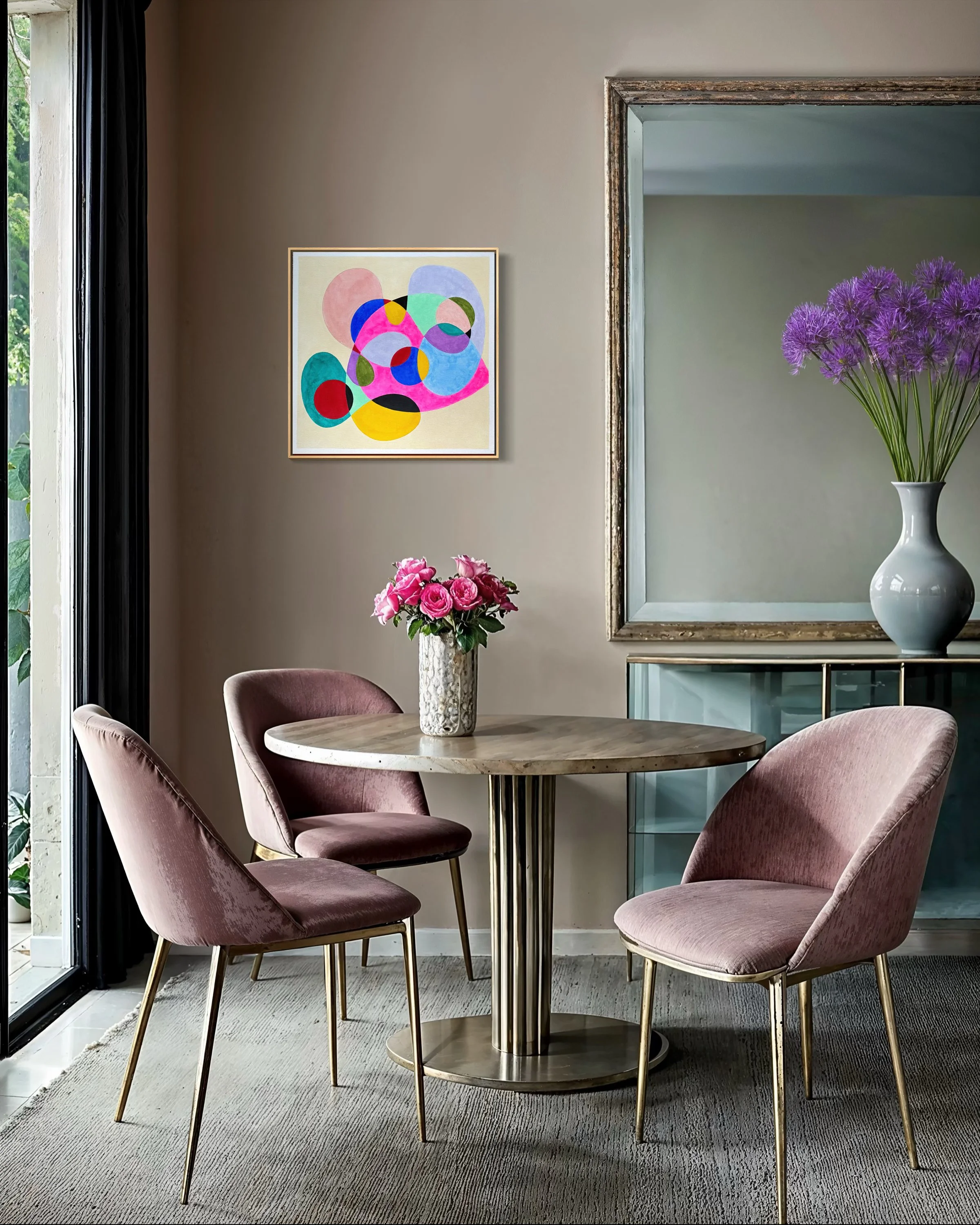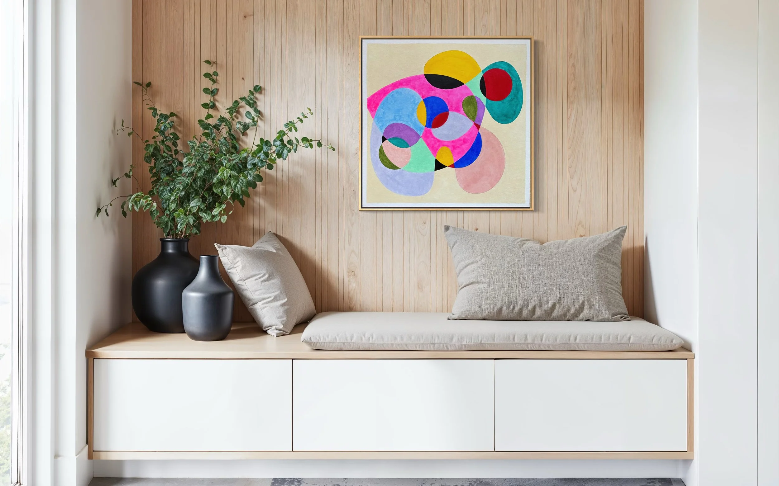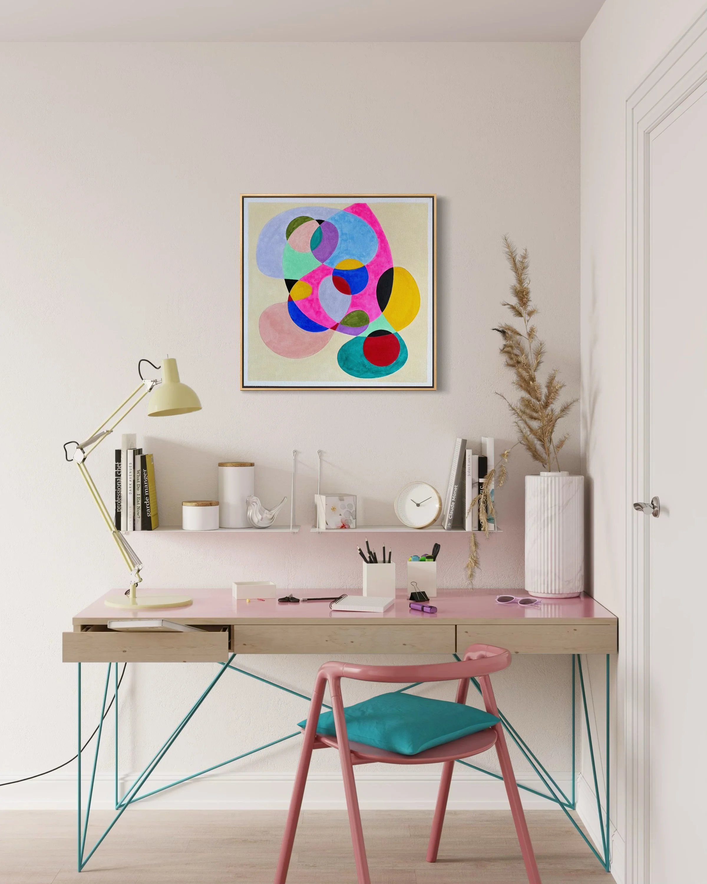 Introducing "Turtle" a 24" x 24" intuitive acrylic painting is a masterclass in organic abstraction. Soft, overlapping shapes in calming pastels (blue, mint, lavender) are dramatically offset by bold black accents and a dominant, high-energy fluorescent pink. The clean lines and graphic composition give this piece its tranquil yet captivating modern appeal. Custom natural wood floating frame included.